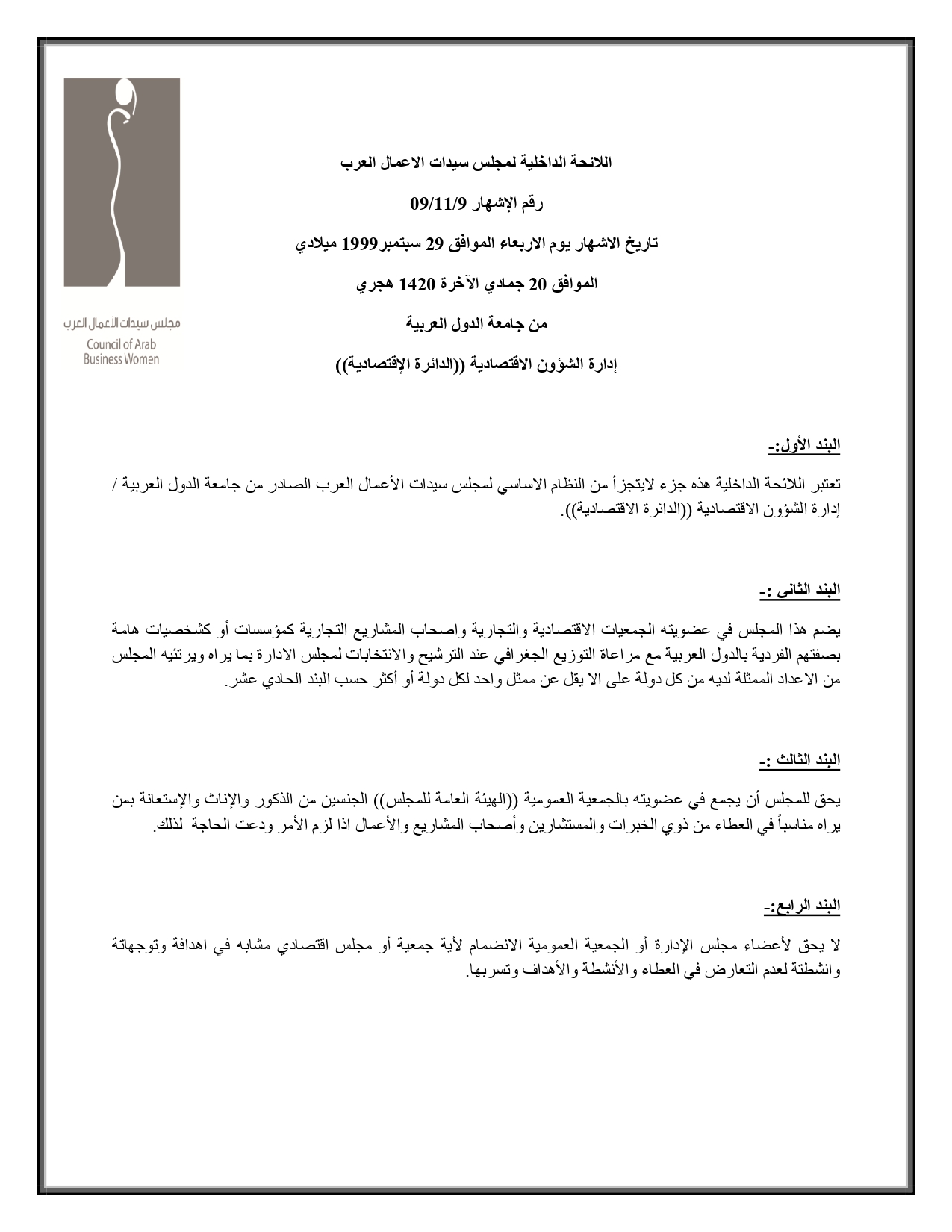 النظام الاساسيللمجلس العربي لسيدات الأعمالمجلس سيدات الاعمال العرب سبتمبر 1999