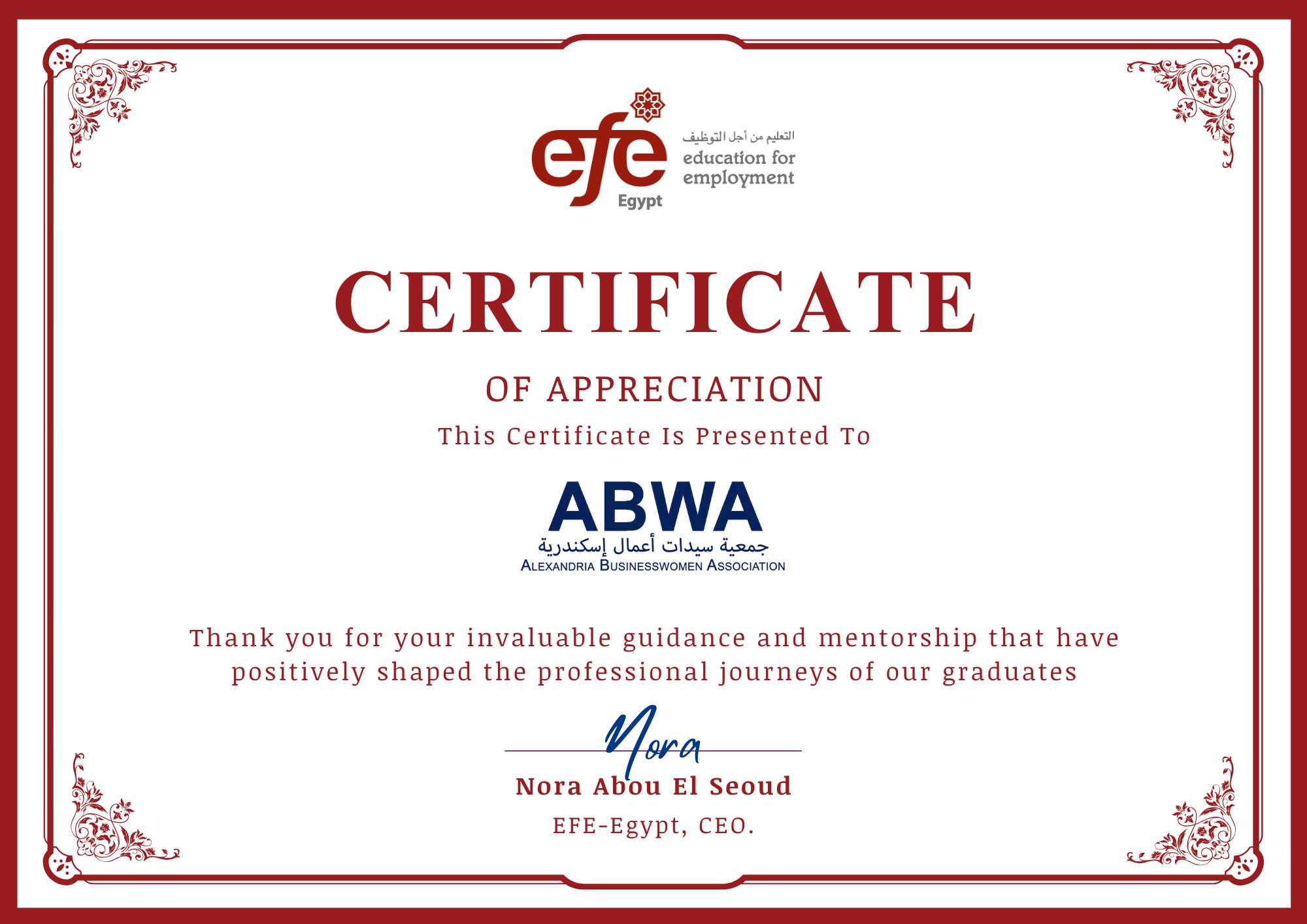 قدّمت مؤسسة التعليم من أجل التوظيف – مصر شهادات تقديرية خاصة للجمعية ولعضواتها الذين شاركوا في الجلسات، تعبيرًا عن امتنانهم وتقديرهم لجهودنا المشتركة.